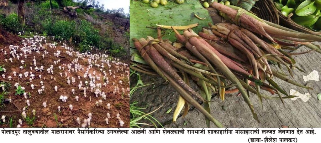 पावसाळयाच्या पहिल्या पंधरा दिवसांत अतिशय छोट्या कोवळ्या आकारात उगवणारी आळंबीची भूछत्रं 20-25 दिवसांनी अगदी तळहाताच्या रूंदीएवढी फोफावतात आणि अतिशय चविष्ट होतात. पेरा हातभर झाल्यानंतर आवणं बांधताना तसेच शेत नांगरताना आळंबी उगवायच्या माळरानातील जागेवरही सहज नजर ठेवून असलेले शेतकरी शेत नांगरून झाल्यानंतर लावणीपूर्वी ही आळंबी खुडून घराकडे नेतात आणि लावणीदरम्यान या आळंबीची रस्साभाजी किंवा मसालेदार कालवण भाकरीवर घेऊन खातात. शेतातील कष्टामुळे निर्माण झालेली क्षुधाशांती करण्याची पध्दत अनेक वर्षांपासून पोलादपूर तालुक्याच्या ग्रामीण भागात दिसून येत असते. काही शेतकर्यांकडे शेवळा ही पावसाळ्यातील रानभाजीदेखील मांसाहारी पद्धतीने बनविण्याची प्रथा आहे.