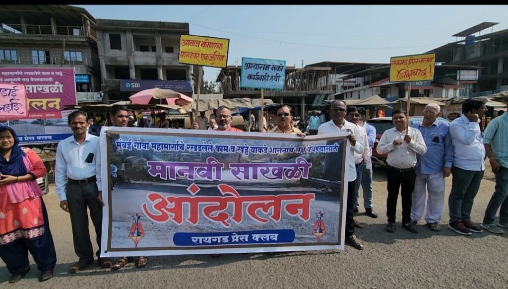चौपदरीकरणाचे काम रखडल्याने आणि दुरावस्था झालेल्या मुंबई गोवा महामार्गाचे काम त्वरित सुरू करण्याच्या मागणीसाठी रायगड जिल्ह्यातील पत्रकारांनी बुधवारी (दि.9) मुंबई-गोवा महामार्गावर कोलाड नाका येथे मानवी साखळी आंदोलन करीत सरकारचे लक्ष वेधून घेतले. मराठी पत्रकार परिषदचे मुख्य विश्वस्त, ज्येष्ठ पत्रकार एस एम देशमुख यांच्या नेतृत्वाखालील हे आंदोलन करण्यात आले. मंजुरीनंतर 11 वर्षे रखडलेल्या या महामार्गाच्या चौपदरीकरणाच्या कामाची उच्चस्तरीय समिती गठीत करून चौकशी व्हावी आणि दोषी ठेकेदार, अधिकारी व संबंधितांवर कडक कारवाई करण्यात यावी अशी मागणीही यावेळी करण्यात आली. पत्रकार आणि नागरिकांनी मोठ्या संख्येने या आंदोलनात सहभाग घेतला.