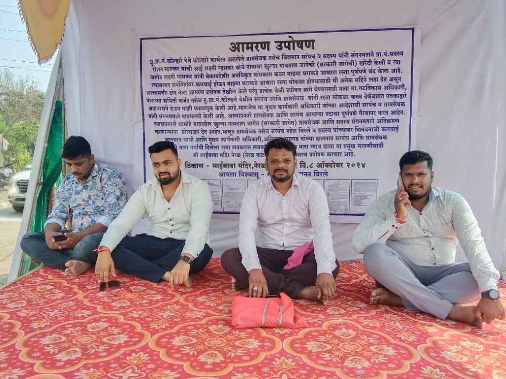 कर्जत तालुक्यातील कोल्हारे ग्रामपंचायतीमधील धामोते गावातील ग्रामस्थांच्या घराकडे जाणारा रस्ता अडविण्यात आला आहे. याचवेळी या रस्त्याच्या खुल्या जागेत घर बांधण्यासाठी संबंधित जागेची विक्री करण्यासाठी ना हरकत दाखला ग्रामपंचायतीकडून देण्यात आला आहे. यामुळे नियमानुसार बाहेर जाऊन निर्णय घेणार्या ग्रामपंचायतीचे सरपंच आणि ग्रामविकास अधिकारी यांच्यावर कारवाई करावी, या मागणीसाठी संजय विरले यांनी नेरळ-कळंब रस्त्यावरील साई मंदिर कोल्हारे फाटा येथे मंगळवारी (दि.8) उपोषणाला सुरूवात केली आहे. त्यांच्या उपोषणाला शिवसेना उध्दव बाळासाहेब ठाकरे पक्ष, राष्ट्रवादी काँग्रेस शरदचंद्र पवार पक्ष आणि शेतकरी कामगार पक्षाने जाहीर पाठिंबा दिला आहे.