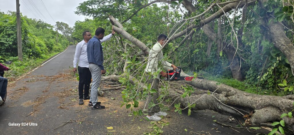 मुरुड तालुक्यात दमदार पडलेल्या पावसामुळे अलिबाग-मुरुड रस्त्यावर सर्वे खिंडीतील नांदगाव वाघोबा मंदिर रस्त्यावर झाड पडल्याने काही वेळ वाहतूकीवर परिणाम झाला होता. मात्र, सुदैवाने जीवित व वित्त हानी टळली आहे. तालुक्यातील या रस्त्यावर सर्वे खिंड येथे रात्रीच्या वेळेस सागाचे तर पहाटेच्या वेळेस वाघोबा मंदिर रस्त्यावर वडाचे महाकाय झाड पडल्याचे वृत्त समजताच सार्वजनिक बांधकाम विभागाचे उप अभियंता रमेश गोरे व शाखा अभियंता यू.एस.राठोड यांच्या मार्गदर्शनाखाली सहाय्यक स्थापत्य अभियंता प्रफुल्ल घोलप, रोशन पाटील, गणेश मार्कंड, संदीप घुले, दर्शन मिठागरे, सावंत तसेच स्थानिकांच्या मदतीने हे झाडे तोडून रस्त्याच्या बाजुला करून रस्ता वाहतुकीसाठी खुला करण्यात आला.