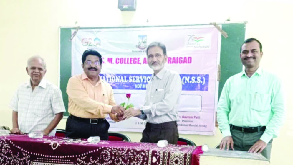 जेएसएम महाविद्यालयात एनएसएस प्रसिद्धी साप्ताहानिमित्त अलिबागचे सुप्रसिद्ध मनोविकार तज्ञ डॉ. अनिल डोंगरे यांचे व्यसनमुक्ती या विषयावर व्याख्यान शनिवारी आयोजित करण्यात आले होते. याप्रसंगी प्राचार्य डॉ. अनिल पाटील, प्रा. शाम जोगळेकर, राष्ट्रीय सेवा योजना कार्यक्रम अधिकारी डॉ. प्रविण गायकवाड, प्रा. अश्विनी आठवले, डॉ. पंकज घरत प्रा. विनायक साळुंखे आणि महाविद्यालयाचे विद्यार्थी उपस्थित होते.