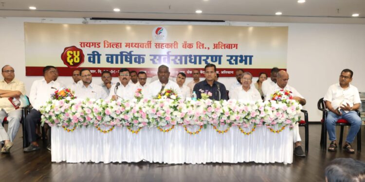 रायगड जिल्हा मध्यवर्ती सहकारी बँकेची ६४वी वार्षिक सर्वसाधारण सभा अलिबाग येथील बँकेच्या केंद्र कार्यालयात पार उत्साहात पडली. बँकेचे अध्यक्ष माजी आ. जयंत पाटील यांनी आर्थिक वर्ष २०२४–२५ चे निकाल जाहीर करताना सांगितले की, बँकेस ८५.८० कोटी रुपये इतका ढोबळ नफा तर ३५.५९ कोटी रुपये निव्वळ नफा मिळाला असून सभासदांना १२.५ टक्के लाभांश देण्यात येणार असल्याचे जाहीर केले. बँकेच्या स्वनिधीचा ७०० कोटी रुपयांचा टप्पा बँकेने पार केलेला असून मार्च २०३० पर्यंत हा स्वनिधी १००० कोटीचा पूर्ण होईल असेही त्यांनी स्पष्ट केले.यावेळी व्यासपीठावर बँकेचे उपाध्यक्ष सुरेश खैरे, बँकेचे मुख्य कार्यकारी अधिकारी मंदार वर्तक, बँकेचे विद्यमान संचालक, माजी संचालक द्वारकानाथ नाईक, बँकेचे माजी मुख्य कार्यकारी अधिकारी प्रदीप नाईक, हे सभेस उपस्थित होते.