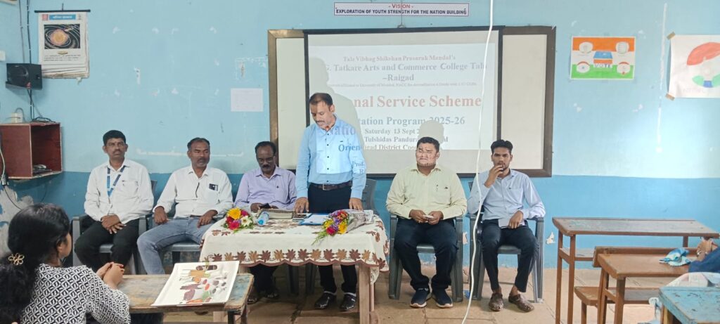 तळा विभाग शिक्षण प्रसारक मंडळाच्या द. ग. तटकरे कला व वाणिज्य महाविद्यालयाच्या राष्ट्रीय सेवा योजना विभागाच्यावतीने शैक्षणिक वर्ष 2025-26 मधील राष्ट्रीय सेवा योजना विभागातील सहभागी स्वयंसेवकासाठीची उद्बोधन कार्यशाळा शनिवार (दि.13) सप्टेंबर रोजी संपन्न झाली. या कार्यशाळेस प्रमुख मार्गदर्शक म्हणून रायगड जिल्हा समन्वयक प्रा. तुळशीदास मोकल उपस्थित होते. या कार्यक्रमाचे प्रास्ताविक राष्ट्रीय सेवा योजना कार्यक्रम अधिकारी डॉ. दत्ता कुंटेवाड यांनी केले. कार्यशाळेचे निवेदन प्रा.भरत चाळके यांनी केले तर कार्यक्रमाचे आभार डॉ.राजाराम थोरात यांनी मानले. या कार्यक्रमास महाविद्यालयातील प्राध्यापक, प्राध्यापकेत्तर कर्मचारी आणि राष्ट्रीय सेवा योजना स्वयंसेवक मोठ्या संख्येने उपस्थित होते.