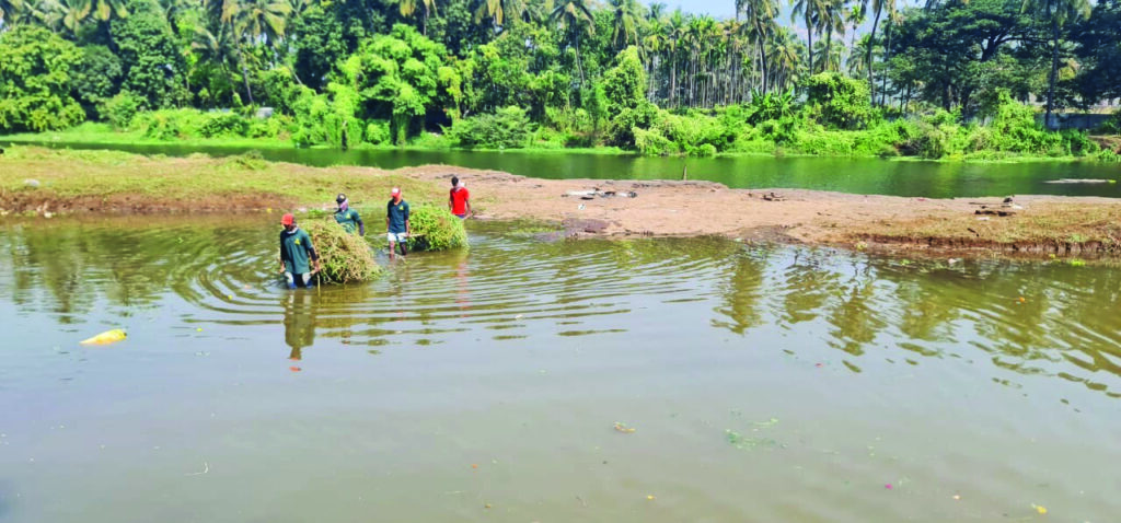 माझी वसुंधरा अभियानाअंतर्गत पेण नगरपरिषद हद्दीतील भोगावती नदीमध्ये वाढलेली जलपर्णी काढण्यासाठी 25 कंत्राटी सफाई कामगार यांच्या मदतीने 2 ट्रॅक्टर घेवून व कचरा ट्रॉली घेवून 15 ते 20 टन नुकतीच जलपर्णी कढण्यात आली.