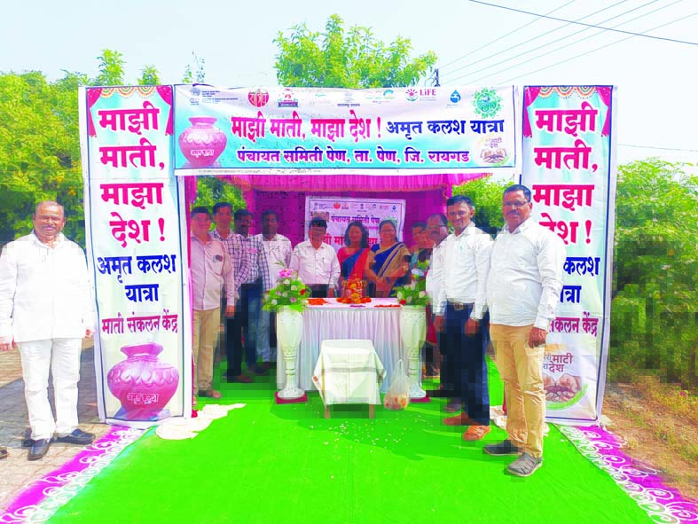 ‘मेरी मिट्टी, मेरा देश’ या अभियानांतर्गत पेण तालुक्यातील 65 ग्रामपंचायतींनी गावोगाव कलश फिरवून माती आणि तांदूळ जमा केले होते. त्या अमृत कलशाचे संकलन पेण पंचायत समिती येथे मोठ्या उत्साहात करण्यात आले.