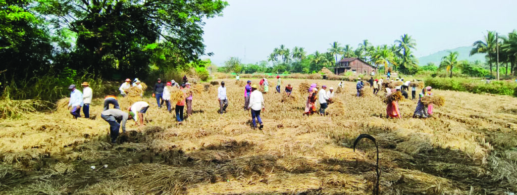 एकीकडे कोकणात शेतीचा कल कमी होत असताना रायगडमध्ये मुरुड तालुक्यात खारआंबोळी गावात 250 गावकऱ्यांनी देवळासमोरील शेतीत भात लावणी पारंपरिक गीते बोलत जुलैला पेरणी केली होती. त्याची कापणी केल्यानंतर शनिवारी सामुदायिक भातबांधणी करून शेतात रचून ठेवले, अशी माहिती माजी सरपंच मनोज कमाने यांनी दिली.