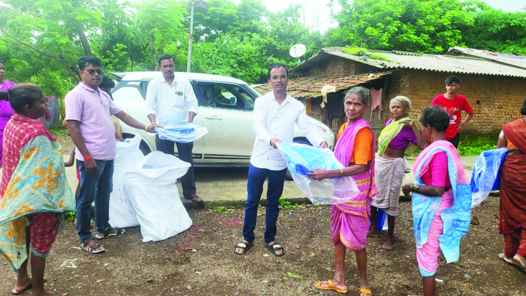 श्रीमद राजचंद्र अक्षम वलसाड गुजरात, नवी मुंबई यांच्यातर्फे पनवेल तालुक्यातील आदिवासी वाडींमध्ये 500 ते 600 ताडपत्रींचे वाटप करण्यात आले.