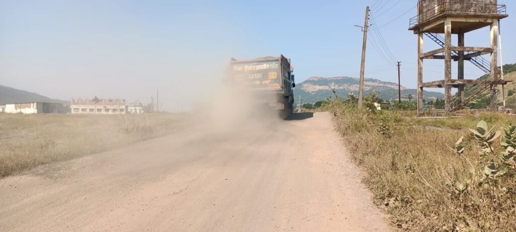 या मार्गाला सन 2017 प्रधानमंत्री ग्राम सडक योजनेतून लाखो रुपयांचा निधी वापरून हा रस्त्याचे नुतनीकरण केले होते, परंतु या रस्त्यावरून रस्त्याच्या क्षमतेपेक्षा अती वजनी वाहन ये-जा करीत असल्याने या रस्त्याची अवस्था अक्षरशः चाळणमय झाल्याने नागरिकांकडून संताप व्यक्त करण्यात येत आहे. आधीच हा रस्ता अरुंद त्यात खड्ड्यांचे साम्राज्य, मोठी कसरत करून नागरिकांना या रस्त्यावर प्रवास करावा लागत आहे. तर या मार्गावर मोठ्या प्रमाणात धुळीचे साम्राज्य पसरत असल्याने असंख्य वाहन चालक, प्रवासी, पादचारी वर्गाला श्वसनाचा त्रास होत असल्याचे याठिकाणी पाहावयास मिळत असून संबंधित प्रशासनाने यावर उपाययोजना राबवून खडी मशीन चालकांवर कारवाई करावी, अशी मागणी सध्या जोर धरत आहे.