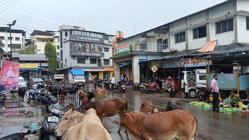 पाली शहरातील नगरपंचायतीच्या मुख्य कार्यालयासमोर मोकाट गुरांचा सुळसुळाट दिवसेंदिवस वाढत चालला आहे. शहर नियोजनाच्या केंद्रस्थानी असलेल्या या परिसरात गुरे मुक्तपणे फिरत असल्यामुळे वाहतूक कोंडी, अपघाताचा धोका आणि सार्वजनिक आरोग्याचा प्रश्न गंभीर बनला आहे. तसेच, रस्त्यावर मोकाट गुरे मलमूत्र टाकत असून, त्याचा थेट परिणाम परिसरातील स्वच्छतेवर आणि नागरिकांच्या दैनंदिन हालचालींवर होत आहे. विशेष म्हणजे, नगरपंचायतीच्या दारातच ही स्थिती असूनही प्रशासनाचे दुर्लक्ष सातत्याने जाणवत आहे. पाली बाजारपेठ, बल्लाळेश्वर मंदिर परिसर, तहसील कार्यालय आणि इतर महत्त्वाच्या ठिकाणीही हीच स्थिती दिसून येते. या परिस्थितीमुळे नागरिकांमध्ये नाराजी वाढत असून, प्रशासनाच्या भूमिकेवर प्रश्नचिन्ह उपस्थित होत आहे.