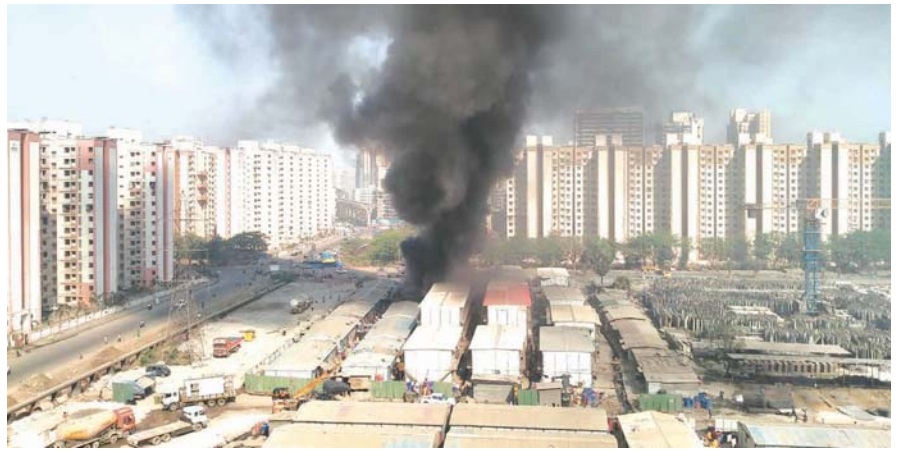 तळोजा फेज-2 मध्ये सिडको गृहनिर्माण प्रकल्पाचे काम शिर्के कन्स्ट्रक्शन कंपनी मार्फत सुरु आहे. या कंपनीत काम करणाऱ्या कामगारांच्या निवासासाठी लोखंडी पत्र्यांची घरे उभारण्यात आली आहेत. या ठिकणी सकाळच्या सुमारास झालेल्या सिलेंडर गॅस गळतीमुळे लागलेल्या आगीत पंधरापेक्षा अधिक घरे जळून खाक झाली. या आगीत कामगारांचे मोठ्या प्रमाणात नुकसान झाले. आगीमुळे परिसरात मोठया प्रमाणात धूर पसरला होता. आगीत बहुतांश घरातील जीवनावश्यक साहित्य जळून खाक झाले. अग्निशमन दल जवानांनी वेळीच तीन सिलेंडर बाहेर काढल्याने जीवितहानी टळली. तळोजा येथील बी. जी. शिर्के कामगार वसाहतीमध्ये गॅस सिलेंडर मधून झालेल्या गळतीमुळे आगीची घटना घडल्याचे दिसून येते. या आगीत कामगारांच्या मालमत्तेचे नुकसान झाले असून, कोणतीही जीवितहानी झाली नाही, असे कळंबोली अग्निशमन केंद्राचे अधिकारी फतेसिंग गायकवाड यांनी सांगितले.