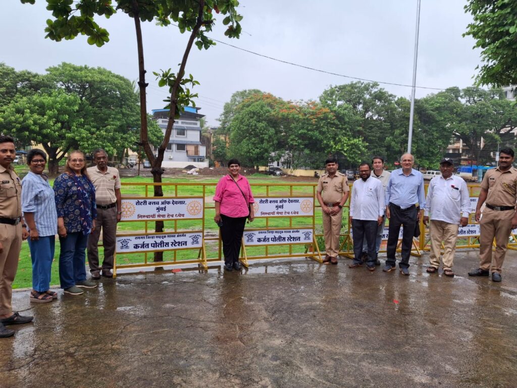 रोटरी क्लब ऑफ देवनार मुंबई यांच्याकडून कर्जत पोलीस ठाण्यास 24 बॅरिकेट्स भेट देण्यात आले. रोटरी क्लब ऑफ देवनार मुंबईचे रोटरीयन अध्यक्ष अजित पप्पू, रो. उपाध्यक्ष संगीता शहाणी, रो. सुरेंद्रनाथ, रो. शोभा लईर, रो. पद्मा कपूर, रो. निखिल गुजर, रो. अर्जुन तरे, रो. अरुण मसणे यांनी कर्जत पोलीस ठाण्याचे पोलीस निरीक्षक सुरेंद्र गरड यांच्याकडे बॅरिकेट्स सुपूर्द केले. यावेळी ठाणे अंमलदार, कर्मचारी उपस्थित होते.