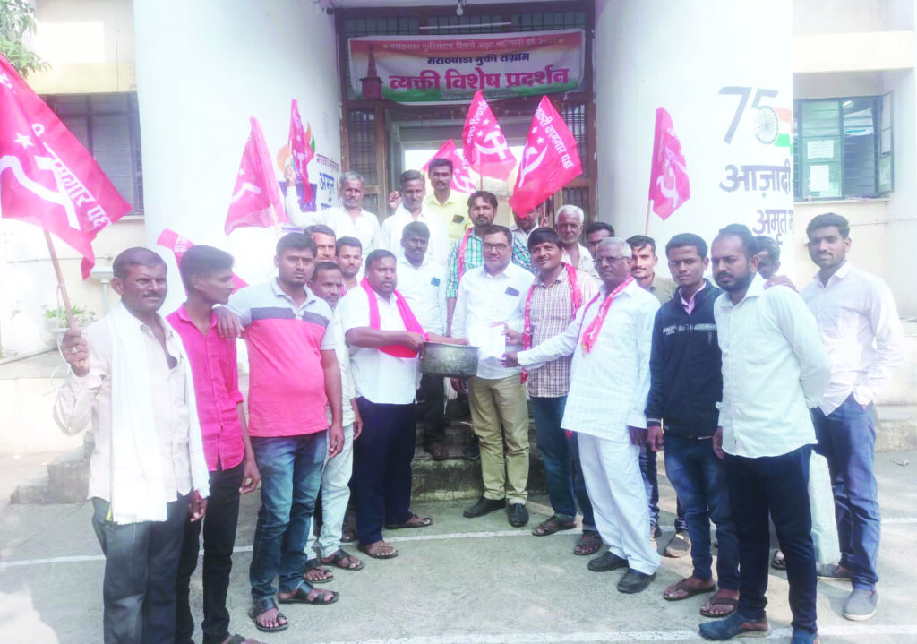 आंदोलनाचे निवेदन नायब तहसीलदार आरसूळ यांच्याकडे दिले. यावेळी शेतकरी कामगार पक्षाचे मुंजा पांचाळ, अनंत चव्हाण, लक्ष्मण चव्हाण, विष्णू शेळके, अशोक आढाव, भारत थेटे, हनुमान पांचाळ, सोमेश्वर माने, रुपेश काळे, विजय काळे, दिनकर सोळंके, उद्धव पांचाळ, दत्ता पांचाळ, हनुमान सोळंके, महादेव बादाडे, सूदर्शन आढाव आदी कार्यकर्ते व शेतकरी बांधव उपस्थित होते.