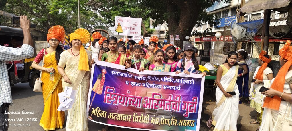 कृषी उत्पन्न बाजार समितीपासून वाजतगाजत निघालेल्या मिरवणुकीत महिलांनी आत्मसन्मान देणारे घोषवाक्य असलेले फलक हातात घेतले होते. या मिरवणुकीचा समारोप महात्मा गांधी वाचनालयाच्या प्रांगणात करण्यात आला. यावेळी ‘अपराजिता’ स्पेशल महिला भारती पवार, मानसी बापट, रजनी गायकवाड, गौरी कातकरी, वंदना वाघमारे आणि महिला सामाजिक कार्यकर्त्यांनी गुढी उभारणी केली.