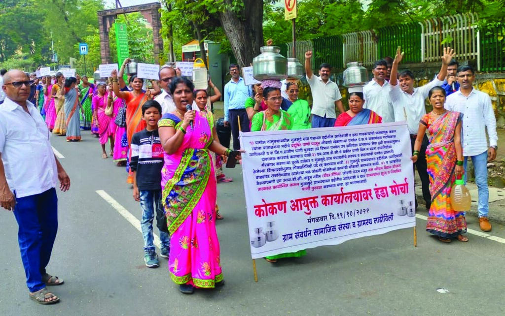ग्रामस्थांची फसवणूक करून त्यांना पाताळगंगा नदीचे प्रदूषित पाणी पाजून जीवाशी खेळणार्या पनवेल पं.स.चे अकार्यक्षम गटविकास अधिकारी संजय भोये व इतर संबंधितांवर दंडात्मक कारवाई करावी. एमआयडीसी कडून नवीन वॉटर टॅपिंग घेऊन मंजूर जलजीवन मिशन योजना तात्काळ कार्यान्वित करून गुळसुंदे ग्रामपंचायत हद्दीतील आदिवासी व इतर ग्रामस्थांना शुद्ध व नियमित पाणी पुरवठा करण्यात यावा. ह्या मागण्यांसाठी ग्राम संवर्धन सामाजिक संस्था, बांधनवाडी व आदिवासी ग्रामस्थ लाडविली यांच्या वतीने सामाजिक कार्यकर्ते संतोष ठाकूर यांच्या नेतृत्वाखाली हा कोकण आयुक्त कार्यालयावर हंडा मोर्चा काढण्यात आला होता. सुमारे चारशे ग्रामस्थ महिला व आदिवासी बांधव या मोर्चात सहभागी झाले होते.
