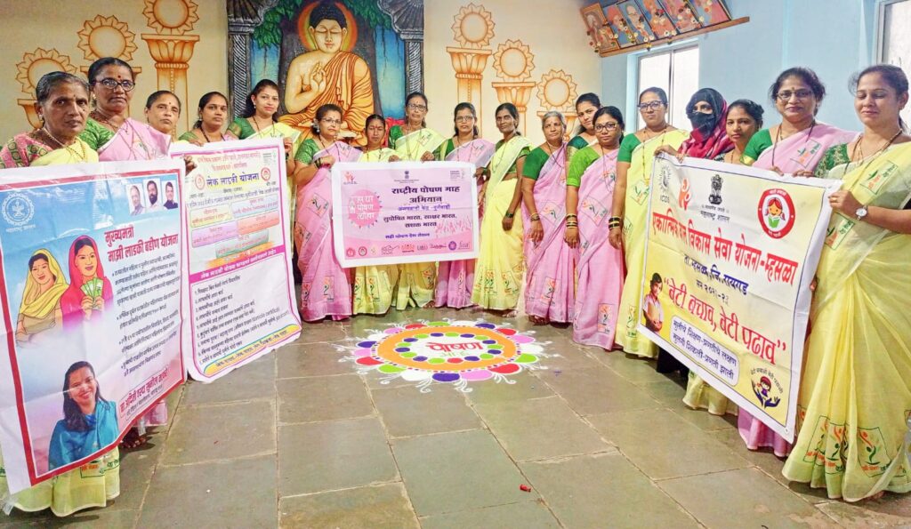 एकात्मिक बाल विकास नागरी प्रकल्प तळा बिट अंतर्गत म्हसळा शहरातील 10 अंगणवाडी, चिराठी, दुर्गवाडी, आदिवासी वाडी, सावर, बौद्धवाडी, राम मंदिर, कुंभारवाडा, नवेनगर, पोस्ट लेन, काझी मोहल्ला मिळून ‘राष्ट्रीय पोषण माह’ अभियान व ‘सही पोषण देश रोशन’ कार्यक्रम राबविण्यात आला. या कार्यक्रमा अंतर्गत किशोरवयीन मुलींना आहार, आरोग्य या विषयावर मार्गदर्शन तसेच तिन ते सहा वर्षे मुलांसाठी पूर्व शालेय शिक्षण, ओटी भरण, अन्न प्राशन दिन, सुपोषण दिवस, टिएचआर पासून बनविलेले पदार्थ, गरोदर व स्तनदा मातांना देण्यात येणार्या सेवा, परसबाग, लेक लाडकी योजना, बेटी बचाव बेटी पढ़ाव, लाडकी बहिण योजना या सर्वांचे फलक लावण्यात आले होते. पदार्थ तसेच हिरव्या भाज्या, कडधान्य, फळ ईत्यादी साहित्य वस्तु स्वरुपात मांडणी करून त्याचे महत्व व फायदे प्रत्येक अंगणवाडी सेविकांच्या मार्फत सांगून उपस्थित मुली, विद्यार्थी, पालक यांना मार्गदर्शन करण्यात आले.