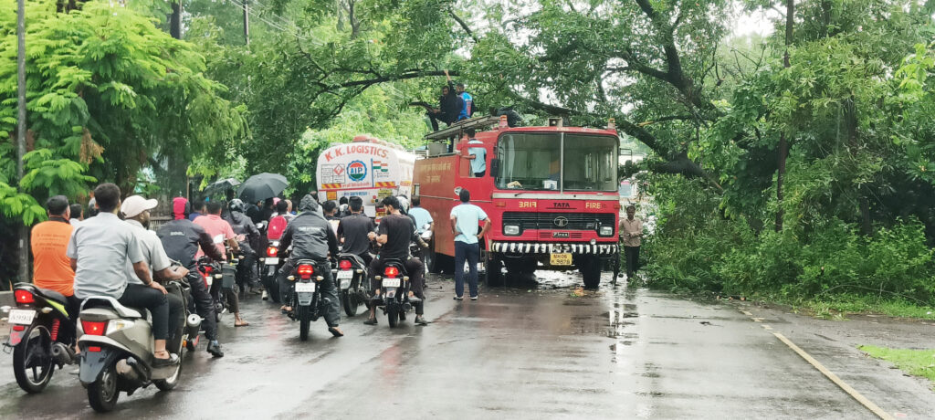 मान्सून कोकणात दाखल झाल्यानंतर रत्नागिरी, रायगडसह रोह्यातसुद्धा पावसाने दमदार हजेरी लावली आहे. अधून मधून विजांचा कडकडाट आणि मेघगर्जनेसह दाखल झालेल्या पावसाने सर्व परिसर ओला चिंब करून टाका आहे. मात्र, झाडांच्या खाली माती भुसभुशीत होऊन काही ठिकाणी झाडे उन्मळून पडत आहेत. असाच एक प्रकार रोह्यात धाटाव औद्योगिक वसाहतीतील अंतर्गत रस्त्यावर मध्यरात्री झाड उन्मळून कोसळले.