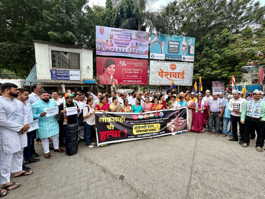 सरकारला प्रश्न विचारले म्हणून 141 खासदारांचे निलंबन केल्या बद्दल पनवेलमध्ये भाजप सरकारविरोधात इंडिया आघाडीच्यावतीने शुक्रवार (दि.22) रोजी छत्रपती शिवाजी महाराज चौकात निषेध आंदोलन करण्यात आले. एकिकडे जनतेचे प्रश्न सभागृहात मांडले म्हणून महासंसदरत्न पुरस्कार जाहीर होतो. तर, दुसरीकडे जनतेचे प्रश्न मांडून सरकारची कोंडी केली म्हणून खासदारांचे निलंबन करून लोकशाहीची हत्या केली जात असल्याचा आरोप यावेळी महाविकास आघाडीच्या नेत्यांकडून करण्यात आला.