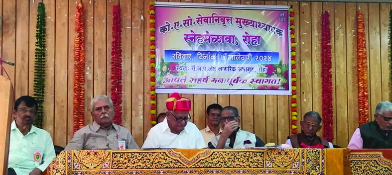 रोहा येथील ज्येष्ठ नागरिक संघटना सभागृहात कोकण एज्युकेशन सोसायटीच्या सेवानिवृत्त मुख्याध्यापकांचा स्नेहमेळावा रविवार दि.7 जानेवारी रोजी उत्साही वातावरणात पार पडला. समारंभाच्या अध्यक्षस्थानी ज्येष्ठ मुख्याध्यापक सदानंद रामकृष्ण मेहेंदळे होते. यावेळी अशोक देशमुख व बळवंत वालेकर, बी.पी.म्हात्रे, पी.डी.साठे, उल्हास ठाकूर, भारती हळदवणेकर ,शेषराव सोनुने, बाळकृष्ण भादेकर, डॉ.श्रीकांत पाटील उपस्थित होते.