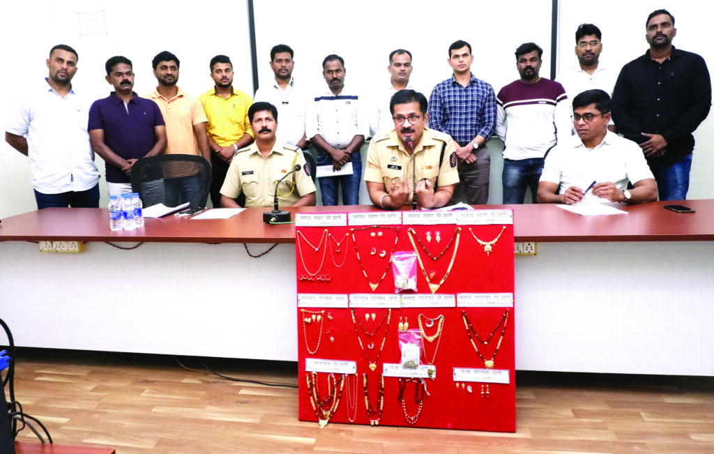 पोलीस उपनिरीक्षक विकास चव्हाण यांना गुप्त महितीदाराकडून घरफोडी करणारा आरोपी संकेत अंजर्लेकर असल्याची माहिती मिळाली. त्यानुसार सापळा रचून महाड नवेनगर येथून आरोपी संकेत याला पथकाने अटक केली. त्याच्याकडे कसून चौकशी केली असता जिल्ह्यातील माणगाव, महाड, तळा, गोरेगाव येथे अकरा ठिकाणी गुन्हे केल्याची कबुली दिली. रत्नागिरी जिल्ह्यातही तीन गुन्हे केल्याचे कबूल केले. 19 लाख 53 हजार 500 रुपये किमतीचे सोने चांदीचे दागिने आणि रोख रक्कमेपैकी 15 लाख 20 हजार 500 चा मुद्देमाल संकेत कडून हस्तगत केला आहे. पोलीस निरीक्षक दयानंद गावडे, पोलीस उपनिरीक्षक विकास चव्हाण, पोह शामराव कराडे, प्रशांत दबडे, अमोल हंबीर, पोना अनिल मोरे, अक्षय पाटील ( सायबर सेल), पोशी अक्षय जगताप, मपोशी जयश्री पळसकर यांनी ही उल्लेखनीय कामगिरी केली.