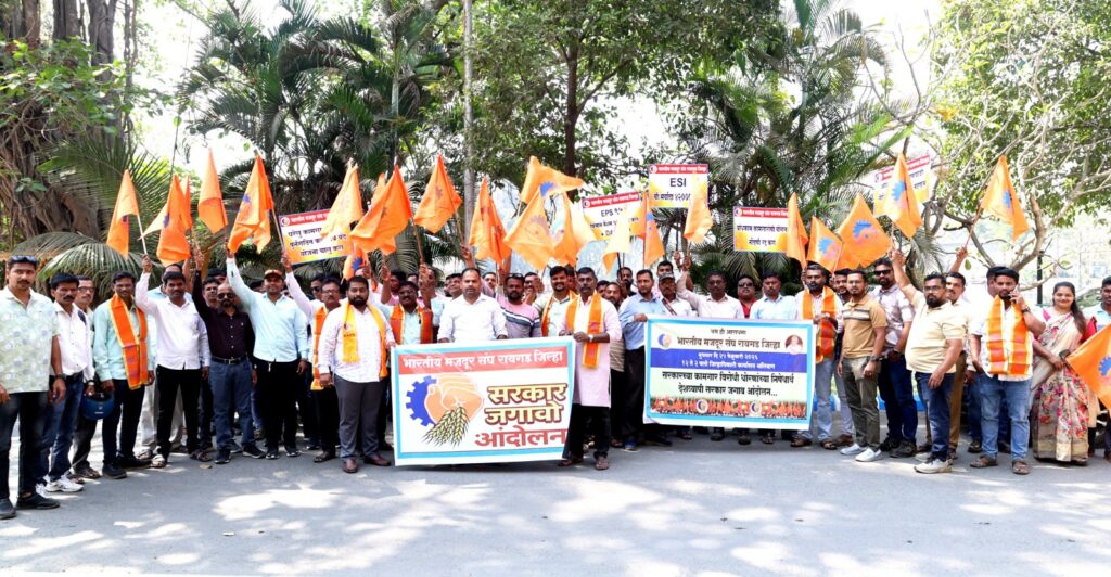 सुरक्षा रक्षकांना वेळेवर वेतन देण्यात यावे. सर्व माथाडी कामगारांची मंडळात नोंदणी करण्यात यावी. सामाजिक सुरक्षा देण्यात यावी, अशा अनेक मागण्यांसाठी भारतीय मजदूर संघाच्या वतीने निदर्शने करण्यात आली. शासनाच्या वेगवेगळ्या धोरणाविरोधात नाराजीही व्यक्त करीत घोषणा देण्यात आली.