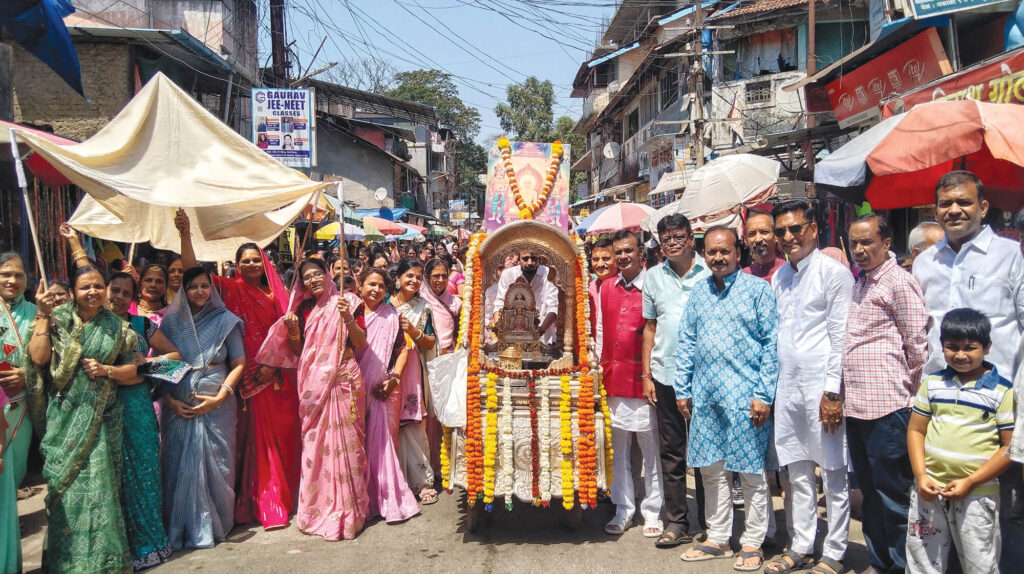 माणगावात जैन बांधवांनी भगवान महावीर यांची जयंती मंगळवारी उत्साहात साजरी केली. या जयंती निमित्त माणगाव बाजारपेठेतून काढण्यात आलेल्या शोभायात्रेत सहभागी झालेले जैन बांधव- भगिनी दिसत आहेत.