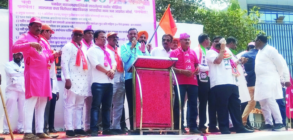 पनवेल महापालिकेतर्फे आकारण्यात येत असलेल्या मालमत्ता करा विरोधात महाविकास आघाडीतर्फे सोमवारी (दि.13 ) आयोजित केलेल्या मोर्चात पालिका हद्दीतील हजारो नागरिक सहभागी झाले होते. यामुळे या मोर्चातून घटक पक्षांनी एका प्रकारे शक्तीपरीक्षण केल्याचे पाहायला मिळाले. शहरातील छत्रपती शिवाजी महाराज चौकातून सुरु झालेल्या या मोर्चात शेकापचे माजी आ. बाळाराम पाटील,95 गाव प्रकल्पग्रस्त संघर्ष समितीचे अध्यक्ष अॅड. सुरेश ठाकूर, मनपाचे माजी विरोधी पक्ष नेते प्रीतम म्हात्रे, शिवसेना जिल्हाप्रमुख शिरीष घरत, राष्ट्रवादीचे सतीश पाटील, प्रशांत पाटील, काँग्रेसचे आर सी घरत, सुदाम पाटील, शेकाप माजी नगरसेवक रवींद्र भगत, गणेश कडू, शिवसेना जिल्हा सल्लागार बबन पाटील, माजी नगरसेवक शिवदास कांबळे यांच्या सोबत परिसरातील कार्यकर्ते आणि नागरिक मोठ्या संख्येने सहभागी झाले होते.