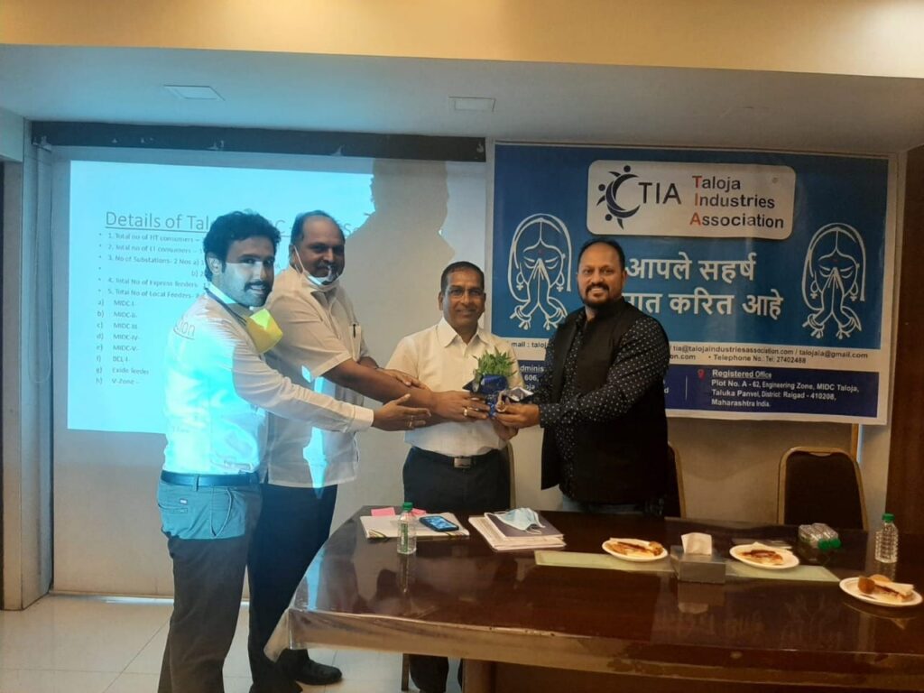 तळोजा इंडस्ट्रीज असोसिएशन (टीआयए) आणि महावितरण यांची संयुक्त बैठक शनिवारी (दि.१८ डिसेंबर ) हॉटेल तनिश रेसिडेन्सी, तळोजा औध्योगिग क्षेत्र येथे आयोजित करण्यात आली होती. ही बैठक विशेषत: उद्योगांना महावितरणचे मुख्य अभियंता यांच्याशी संवाद साधण्यासाठी आणि महावितरणशी संबंधित असलेल्या विविध समस्यांवर चर्चा करण्यासाठी आयोजित करण्यात आली होती. या कार्यक्रमास महावितरणचे मुख्य अभियंता सुरेश गणेशकर, अधीक्षक अभियंता राजाराम माने, कार्यकारी अभियंता सतीश सरसोदे, अतिरिक्त कार्यकारी अभियंता देविदास बायकर, सहाय्यक अभियंता आदित्य धांडे, सहाय्यक अभियंता कुणाल आंबटकर, टीआयएचे अध्यक्ष सतीश शेट्टी (अण्णा), उपाध्यक्ष बाबू जॉर्ज, सचिव रोहित बन्सल, कोषाध्यक्ष बिनीत सालियन, सरचिटणीस बिदुर भट्टाचार्जी, कार्यकारी सचिव सुनील पाधीहारी तसेच तळोजा एमआयडीसी मधील एक्साइड इंडस्ट्रीज, अल्ट्राटेक, फोर्स्टार फ्रोझन फूड्स इत्यादी सर्व क्षेत्रातील अनेक औद्योगिक प्रतिनिधी उपस्थित होते.