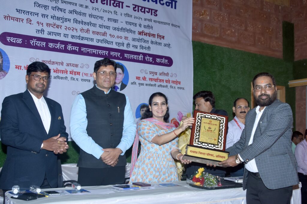 रायगड जिल्हा परिषदेच्या कामकाजात अभियंता वर्गाची भूमिका आणि त्यांची कामाबद्दलची बांधिलकी महत्वाची असल्याचे कौतुक मुख्य कार्यकारी अधिकारी नेहा भोसले यांनी केले आहे. कर्जत येथे जिल्हा परिषद अभियंता दिनाच्या निमित्ताने ‘अभियंता सन्मान’ सोहळ्याचे आयोजन करण्यात आले होते. त्यावेळी त्या बोलत होते. कर्जत येथील रॉयल कॅम्प येथे रायगड जिल्हा परिषदेतील विविध विभागातील अभियंता संघटनांच्यावतीने अभियंता दिन कार्यक्रमाचे आयोजन करण्यात आले होते. या अभियंता दिनाच्या कार्यक्रमाला जिल्हा परिषदेच्या मुख्य कार्यकारी अधिकारी नेहा भोसले, अतिरिक्त मुख्य कार्यकारी अधिकारी सत्यजित बढे, जिल्हा परिषद ग्रामीण पाणीपुरवठा विभागाचे कार्यकारी अभियंता मोहन सरवदे, बांधकाम विभागाचे राहुल देवांग, संघटनेचे अध्यक्ष सुजित धनगर आणि कर्जत पंचायत समितीचे गटविकास अधिकारी सुशांत पाटील यांच्यासह जिल्ह्यातील 15 तालुक्यातील उप विभागाचे उप व शाखा अभियंता, संघटनेचे माजी अध्यक्ष सदानंद शिर्के, सुरेश इंगळे, परब, शाखा अभियंता गोपाने, मते व मंगेश सावध आदी उपस्थित होते.