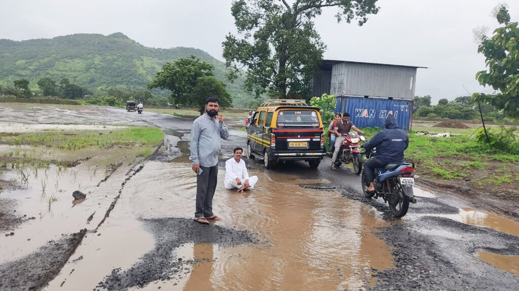 कर्जत कोंडीवडे या राज्यमार्गावरील शिरसे गावाजवळ निर्माण झालेल्या खड्ड्यांमुळे वाहन चालकांना नाहक त्रास सहन करावा लागत आहे. त्या खड्ड्यांबाबत सार्वजनिक बांधकाम विभागकडून कोणत्याही प्रकारची कार्यवाही केली जात नाही. त्यामुळे पोलीस मित्र संघटनेचे कार्यकर्ते प्रदेश उपाध्यक्ष रमेश कदम यांनी या रस्त्यावरील खड्ड्यात बसून आंदोलन सुरू केले आहे. दरम्यान, या अनोख्या आंदोलनाची चर्चा सुरू झाली असून सार्वजनिक बांधकाम खात्यावर खड्डे भरण्यासाठी दबाव आला होता.