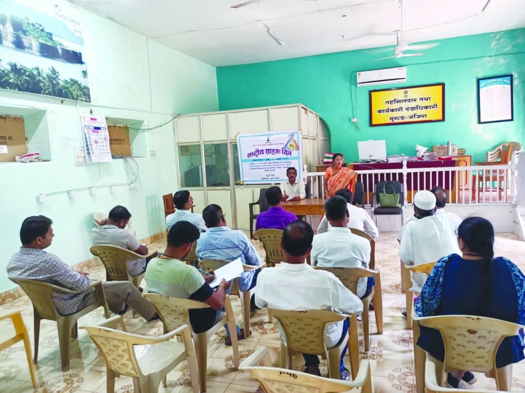 मुरूडच्या तहसील कार्यालयात राष्ट्रीय ग्राहक दिन नुकताच साजरा करण्यात आला. नायब तहसीलदार गोविंद कोटंबे, पुरवठा शाखेचे सचिन राजे रास्त भाव धान्य दुकान संघटनेचे अध्यक्ष गिरीष साळी, अजित कासार, सचिन कासेकर यांसह ग्राहकवर्ग यावेळी उपस्थित होता. सुरुवातीला सर्व उपस्थितांचे स्वागत करण्यात येऊन कार्यक्रमाला सुरुवात करण्यात आली. नायब तहसीलदार गोविंद कोटंबे यांनी सर्व उपस्थितांचे स्वागत केले. सचिन राजे यांनी आभार मानले.