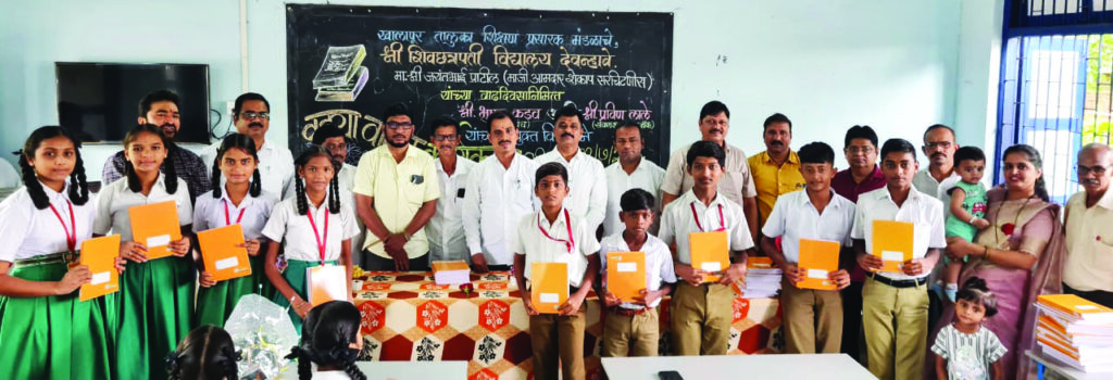 शेतकरी कामगार पक्षाचे सरचिटणीस जयंत पाटील यांच्या वाढदिवसानिमित्ताने पुरोगामी युवकचे नेते, उपसरपंच भूषण पाटील आणि आरडीसी बँकेचे संचालक प्रविण लाले यांच्या माध्यमातून 20 शाळांमधील विद्यार्थ्यांना वह्यावाटप करण्यात येत आहे. या कार्यक्रमाचा प्रारंभ श्री छत्रपती विद्यालय देवन्हावे येथून करण्यात आला. या कार्यक्रमासाठी केटीएसपी मंडळाचे अध्यक्ष संतोष जंगम, कार्यवाह किशोर पाटील, शेकाप नेते शांताराम पाटील, खोपोली शहर खजिनदार जयंत पाठक, माजी उपसरपंच संजय कडव, संदेश चौधरी, माजी सरपंच भगवान पाटील, बंटी नलावडे, स्नेहा कडव, ज्ञानेश्वर नलावडे, नरेंद्र चव्हाण, विनोद कडव, प्रफुल्ल बारस्कर, समर कडव, अंकुर भोपतराव, प्रतिक नलावडे, नितेश चौधरी आदि उपस्थित होते.