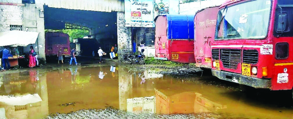न बुजवलेले खड्डे, स्थानकात चिखलाचे झालेले साम्राज्य, तसेच साचलेल्या पाण्यामुळे स्थानकाला आलेल्या तळ्याचे स्वरूप यामुळे हजारो प्रवाशांना व एसटी कर्मचार्यांना दररोज त्रास सहन करावा लागत आहे. तरीही ठेकेदारांना मात्र न बुझविलेल्या खड्ड्यांचे हजारो रुपये अदा झाल्यास नक्की कोणाच्या पोटाचा खड्डा भरणार असा प्रश्न संतप्त प्रवासी करीत आहेत.
