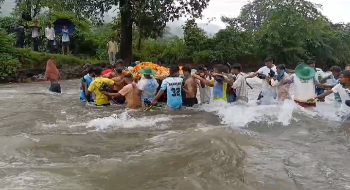 आदिवासी बांधवांच्या जीवाशी खेळ; वाहत्या नदीतून प्रेत नेण्याची वेळ