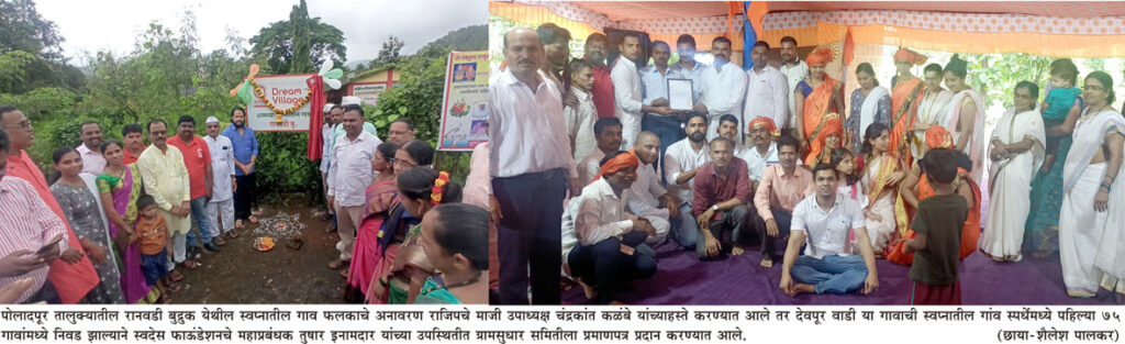 स्वप्नातील गाव स्पर्धेत पोलादपूर तालुक्यातील रानवडी बुद्रुक आणि देवपूरवाडी ही गावे स्वदेस फाऊंडेशनतर्फे स्वप्नातील गावे घोषित करण्यात आली. स्वदेस फाऊंडेशनचे महाप्रबंधक तुषार इनामदार यांनी दोन्ही गावांमध्ये जाऊन ग्रामसुधार कमिटीला या स्वप्नातील गाव निवडीचे पत्रक प्रदान केले. यावेळी रानवडी बुद्रुक या गावाने तंटामुक्ती, निर्मलग्राम, वनग्राम तसेच अन्य पारितोषिके पुरस्कार प्राप्त केल्याने आता स्वप्नातील गाव संकल्पनेद्वारे स्वदेस फाऊंडेशनच्या माध्यमातून या गावाने विकास साध्य करावा, असे मत चंद्रकांत कळंबे यांनी व्यक्त केले.