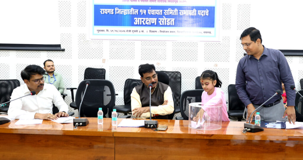 रायगडचे जिल्हाधिकारी किशन जावळे यांच्या अध्यक्षतेखाली जिल्ह्यातील 15 पंचायतीच्या सभापती पदाचे आरक्षण काढण्यात आले. जिल्हा नियोजन समितीच्या सभागृहात ही प्रक्रीया राबविण्यात आली. मयुरा महाडीक आणि कायरा शिंदे या दोन मुलींच्या हस्ते सोडत काढण्यात आली. सामान्य प्रशासन विभागाचे उपजिल्हाधिकारी रविंद्र शेळके यांनी आरक्षणाचे वाचन केले.
