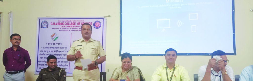 तळा येथील जी. एम. वेदक विज्ञान महाविद्यालय येथे गुरुवारी (दि.22) राष्ट्रीय सेवा योजना विभागाच्या वतीने रस्ता सुरक्षा विषयावर जनजागृती कार्यक्रमाचे आयोजन करण्यात आले होते. या कार्यक्रमास मोटार वाहन निरीक्षक सूर्यकांत गंभीर व सहाय्यक मोटार वाहन निरीक्षक विशाल जाधव प्रमुख पाहुणे म्हणून उपस्थित होते.