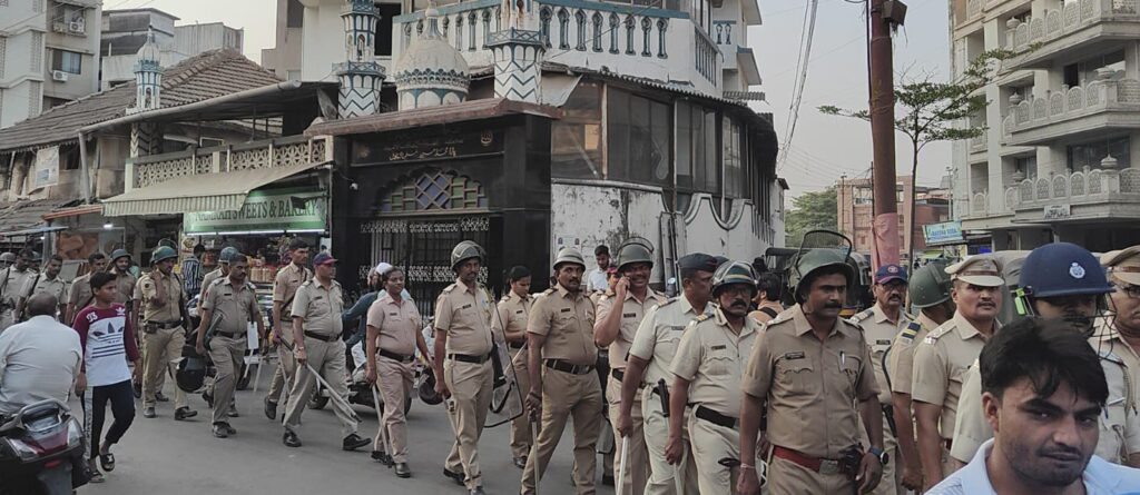 पोलादपूर पोलीस ठाण्याचे पोलीस निरिक्षक अनिल जाधव आणि पोलीस कर्मचारी तसेच, गोरखा निमलष्करी दलाच्या दोन प्लॅटून्सचे दुपारी साडेतीन वाजता तालुक्यातील कापडे आणि चार वाजता पोलादपूर शहरामध्ये 40 अंश तापमानात संचलन करण्यात आले.