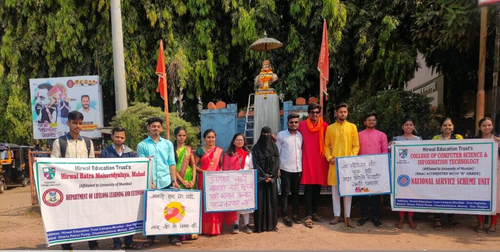 यानंतर विद्यार्थ्यांनी धारिया पेट्रोल पंप चांभारखिंड व छत्रपती शिवाजी महाराज चौक , महाड येथे पथनाट्य सादरीकरण करून समाजात जनजागृती केली. यावेळी किशोर धारिया,सोनाली धारिया डॉ. संध्या कुलकर्णी यांच्या प्रोत्साहनाने विविध विषयावर जनजागृती करण्याकरिता महाविद्यालयाचे सुदेश कदम यांच्या मार्गदर्शनाखाली विविध कार्यक्रमांचे आयोजन करण्यात येते