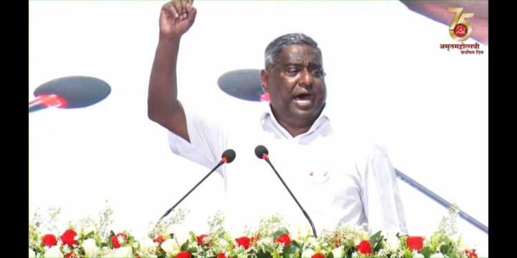 वडखळ येथे स्व. भाई मोहन पाटीलनगरीत आयोजित करण्यात आलेल्या शेतकरी कामगार पक्षाच्या अमृतमहोत्सवी वर्धापनदिन सोहळ्यात ते बोलत होते. या सोहळ्याला आम आदमी पक्षाचे दिल्ली सरकारमधील पर्यावरणमंत्री गोपाळ राय, शेतकरी संघटनेचे नेते माजी खासदार राजू शेट्टी, माजी मंत्री मीनाक्षी पाटील, आमदार आमदार बाळाराम पाटील, आमदार श्यामसुंदर पाटील, माजी आमदार धैर्यशील पाटील, आपचे महाराष्ट्र प्रभारी दीपक सेहगल, माजी आमदार पंडित पाटील, जिल्हा चिटणीस आस्वाद पाटील, पुरोगामी युवक संघटनेचे प्रदेशाध्यक्ष डॉ. बाबासाहेब देशमुख, प्रदेश महिला आघाडी प्रमुख आशाताई शिंदे, ज्येष्ठ नेते प्रा.एस.व्ही. जाधव, अ‍ॅड. राजू कोरडे, माजी नगराध्यक्ष डॉ प्रशांत नाईक, पनवेल मनपाचे विरोधी पक्षनेते डॉ प्रितम म्हात्रे, पुरोगामी युवक संघटनेच्या राज्य अध्यक्ष साम्या कोरडे, नाना सावंत, पनवेलचे माजी नगराध्यक्ष जे.एम. म्हात्रे, जि.प. माजी अध्यक्षा अ‍ॅड. नीलिमा पाटील, चित्रा पाटील, महिला आघाडी प्रमुख चित्रलेखा पाटील, राहूल देशमुख, विकास शिंदे, रामदास जराते, नृपाल पाटील आदी मान्यवर उपस्थित होते.