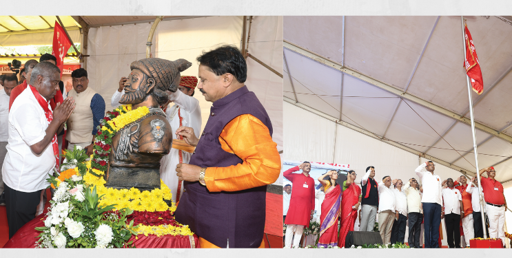 महाराष्ट्राचे आराध्य दैवत छत्रपती शिवाजी महाराजांना अभिवादन करुन कार्यक्रमाचा सुरुवात करण्यात आली. त्यानंतर रक्तरंजित इतिहासाची क्रांती घडवून शासनास जागं करणारा लाल बावटा सर्वांनाच ज्ञात आहे. याच लाल बावट्याच्या क्रांतीने सर्वसामान्य जनतेला न्याय मिळाला आहे. असा लाल बावटा शेकापचे सांगोल्याचे आ. बाबासाहेब देशमुखांच्या हस्ते फडकविण्यात आला. त्यानंतर उपस्थितांनी सलामी दिली. दरम्यान, कार्यकर्त्यांना स्फूर्ती देणारे, अंगात नवचेतना निर्माण करणारे ‌‘रंगाने हा रंगलेला, लाल बावटा लाल.. करीतो आम्ही सलाम त्याला, करीतो आम्ही सलाम‌’ या शेकाप ध्वजगीताचे गायन करण्यात आले. यावेळी सर्व वातावरण भारावून गेले होते. दरम्यान, ‌‘जय जय महाराष्ट्र माझा‌’ या राज्यगीताचे गायनसुद्धा कार्यक्रमादरम्यान करण्यात आले.