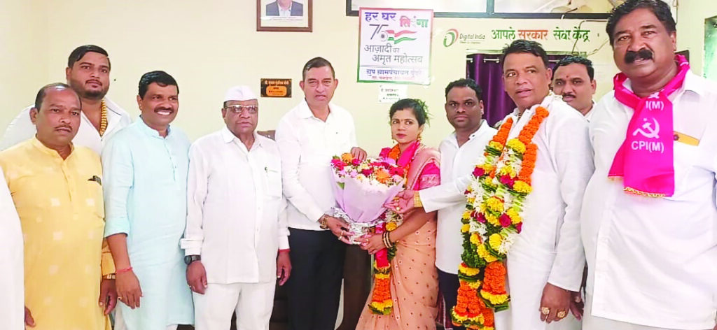 शेतकरी कामगार पक्षाच्या शितल कैलास भोपी यांची दूंदरे ग्रामपंचायतीच्या उपसरपंचपदी बिनविरोध निवड करण्यात आली आहे. दूंदरे ग्रामपंचायतीचे उपसरपंच जयदास चौधरी यांनी राजीनामा दिल्यानंतर थेट सरपंच सुभाष भोपी यांच्या मार्गदर्शनाखाली शेतकरी कामगार पक्षाच्या ग्रामपंचायत सदस्या शितल कैलास भोपी यांची बिनविरोध निवड करण्यात आली. यावेळी ग्रामपंचायतीचे शेकापचे सर्व सदस्य उपस्थित राहून पाठिंबा दर्शवून शुभेच्छा दिल्या. यावेळी शुभेच्छा देण्यासाठी माजी आमदार बाळाराम पाटील, माजी सभापती काशिनाथ पाटील, माजी उपसभापती राजेश केणी, माजी जिल्हा परिषद सदस्य विलास फडके, रायगड भूषण भारत भोपी तसेच ग्रामपंचायत सदस्य कैलास भोपी, विश्वास पाटील, महेश पाटील, सुप्रिया करनेरकर, शकुंतला गोसावी, ग्रामस्थ महादेव गायकर, साईनाथ भोपी, बाळाराम पाटील, दिपक पाटील आदी मंडळींनी ग्रामस्थ नागरिकांनी शुभेच्छा देऊन वाजत गाजत नाचत रथात मिरवणूक काढण्यात आली.