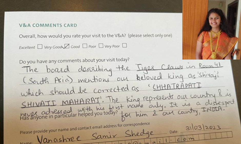 रोहा येथिल वनश्री शेडगे ही मुलगी उच्चशिक्षणासाठी सद्या लंडनमध्ये आहे, तेथील म्युझियममध्ये छत्रपती शिवरायांचा एकेरी उल्लेख पाहताच वनश्रीने क याविषयी लेखीपत्र मेलद्वारे पाठवित लक्ष वेधले, म्युझियम प्रशासनाने याची गंभीर दखल घेतली असून त्यांनी तसे वनश्रीला कळविले आहे.