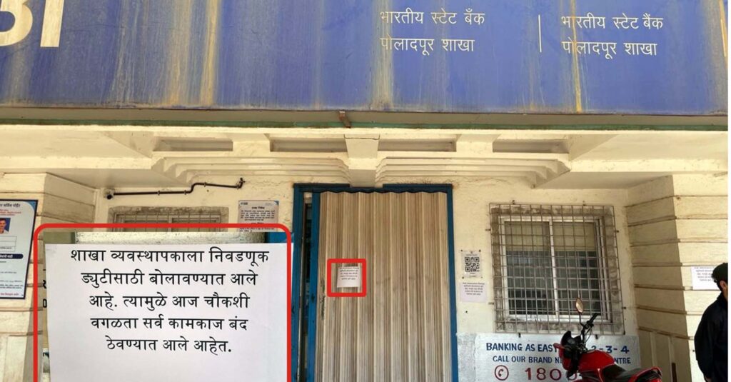 लोकसभा निवडणुकीच्या पार्श्वभूमीवर पोलादपूर येथील स्टेट बँक ऑफ इंडियाच्या शाखेतील शाखा प्रबंधक व कर्मचारी यांना रायगड लोकसभा निवडणूक शाखेने अधिग्रहित केले आहे. यामुळे हे अधिकारी शाखेमध्ये नसल्यामुळे रक्कम ट्रान्सफर करण्याची सेवा तसेच, बँक मॅनेजरच्या सहीने होणार्या ग्राहकसेवा सध्या दिल्या जात नाहीत. यामुळे ग्राहकांची मोठी गैरसोय झाली असून, त्यांच्या प्रश्नांना उत्तरे देण्याचे टाळण्यासाठी ‘शाखा व्यवस्थापकाला निवडणूक ड्युटीसाठी बोलविण्यात आले आहे. त्यामुळे आज चौकशी वगळता सर्व कामकाज बंद ठेवण्यात आले आहे.’ असा फलक लावण्यात आला आहे.