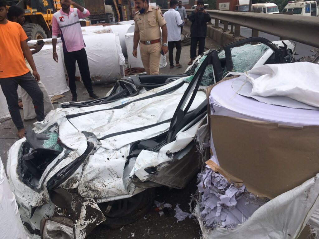कारला फाडून त्याचा मृतदेह बाहेर काढावा लागला. चालक नवी मुंबईतील डॉक्टर असल्याचे समजते.मिळालेल्या माहितीनुसार सकाळी साडेदहाच्या सुमारास नवी मुंबई येथील डॉक्टर आदित्य तंखीवले हे हुंदाई आयटेन या त्यांच्या कारने पुण्याहून मुंबईकडे येत असताना एक्स्प्रेस हायवेवर 40 किलोमीटर अंतरावर ते आले असता त्यांच्या समोर जात असलेला ट्रेलर वळणावर कलंडला व पलटी झाला. त्या ट्रेलरमध्ये कागदाचे भले मोठे रिम होते व ते रिम त्या ट्रेलरमधून सटकले त्यातील काही रिम मागून जात असलेल्या आदित्य तंखीवले यांच्या कारवर ही कोसळले.