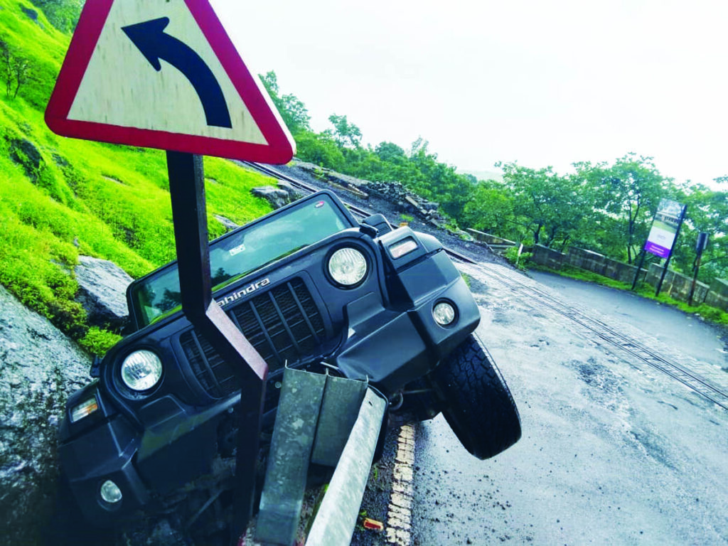 गुजरात राज्याची पासिंग असलेली महेंद्र कंपनीची थार या कारमध्ये चार प्रवासी प्रवास करीत होते. मात्र, ते बालबाल बचावले असून, किरकोळ जखमी झालेत. चालकाचे वाहनावरील नियंत्रण सुटल्याने अपघात घडला. काही काळ येथे वाहतूक कोंडी झाली होती. माथेरान घाटातील जुमापट्टी या रेल्वे स्थानकाच्या वरील पहिला क्रॉसिंग रेल्वे ट्रॅक वळणावर हा अपघात घडला. घाट उतरत असलेल्या स्कुटी चालक महिलेला वाचवण्याच्या प्रयत्नात कारमधील चालकाचे वाहनावरील नियंत्रण सुटले आणि रस्त्याच्या कडेला असणारी सुरक्षा लोखंडी रेलिंग तोडून थेट कार खड्ड्यात जाऊन अपघातग्रस्त झाली. सुदैवाने यात कुठलीही जीवितहानी झाली नसली तरी कारचे मोठे नुकसान झाले आहे. कार गुजरात पासिंग असून हे पर्यटक अहमदाबाद येथून आल्याचे सांगण्यात आले होते. त्यांच्या सोबत आणखी काही मित्र दुसऱ्या कारमध्ये होते. अपघातग्रस्त कार टॉय करून बाहेर काढण्यात आली. त्यामुळे वाहतुकीस होणारा अडथळा दूर झाला.