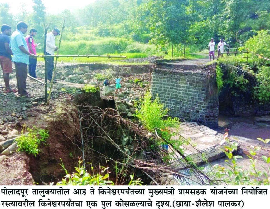 मुख्यमंत्री ग्रामसडक योजनेंतर्गत आड ते किनेश्वर रस्त्याचे भूमीपूजन नुुकतेच पालकमंत्री अदिती तटकरे यांच्या हस्ते करण्यात आले होते.त्यावरुन परिसरातील राजकारणही चांगलेच तापले होते.शिवसेना,राष्ट्रवादीमध्ये पक्षांतर सोहळेही झाले होते. कथित काँग्रेस कार्यकर्त्यांच्या प्रवेशाचे राजकारण तापले असताना आता हा किनेश्वर रस्त्यावरील पूल कोसळल्याने राजकीय आडाखेही कोसळले आहेत. दरम्यान, हा पूल कोसळल्याने पोलादपूर तहसिल कार्यालयातील मंडलअधिकारी सिनकर आणि तलाठी फुलवर यांनी अहवाल तयार करून तहसिल कार्यालयाला सादर केला आहे.
