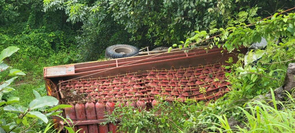 मुंबई-गोवा महामार्गावरील कशेडी घाटात उरण ते लोटे नायट्रोजन गॅस वाहतूक करणारा आयशर टेम्पो खचलेल्या रस्त्यावरून चढत असताना गती न घेतल्याने पाठीमागे येऊन खोल दरीत कोसळला. या अपघातात चालक गंभीर झाला असून वायू गळतीमुळे वाहतूक पोलीस सतर्कतेने प्रसंग हाताळत असल्याचे दिसून आले.