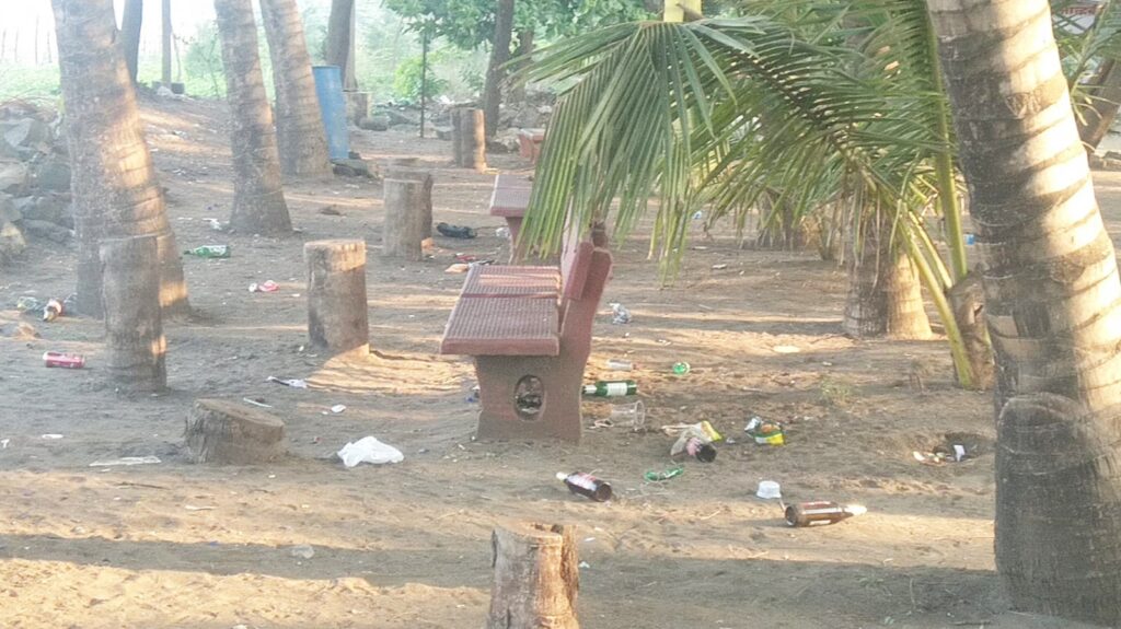 रात्री उशिरापर्यंत सुरू व माड बनात दारू व बिअरचे सेवन, धुडगूस आणि आरडाओरडा सुरू असतो. सकाळी या परिसरात मद्याच्या बाटल्यांचा खच, चकण्यांचा कचरा आणि घाण साचलेली दिसते. बसण्यासाठी ठेवलेल्या बाकांवरही बाटल्या व कचरा टाकलेला आढळतो. परिणामी, विरंगुळ्यासाठी येणाऱ्या स्थानिक, पर्यटक व पाहुण्यांचा हिरमोड होत आहे. महिलांसाठी तर या भागात रात्री वावर असुरक्षित झाल्याची भावना व्यक्त केली जात आहे.