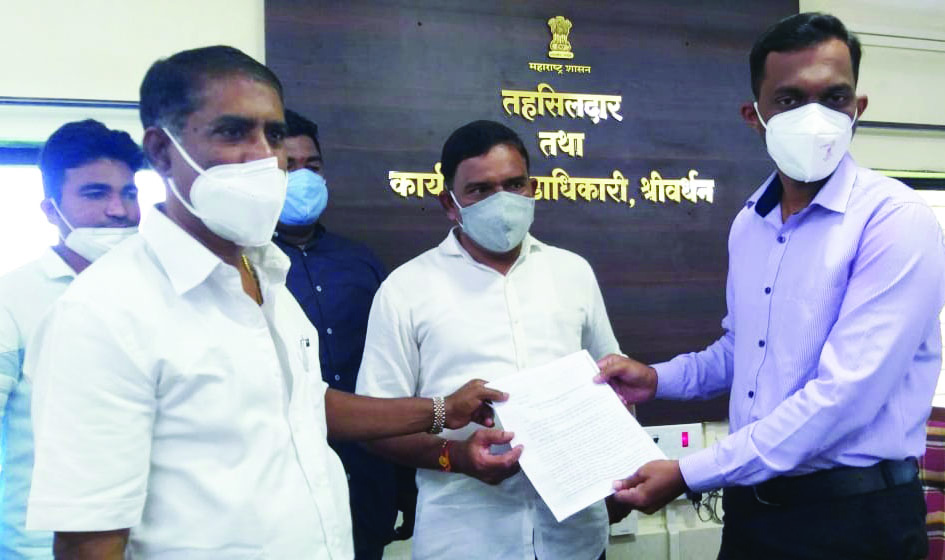 चक्रीवादळात नुकसानभरपाई मिळाली मात्र जनतेत समाधान नसल्याचं देखील पाटील यांनी सांगितलं कोरोना काळात लोकांचा व्यवसाय बुडाला आहे लोकांना जेवणाचे हाल होत आहेत. महागाईच्या विरोधात हल्लाबोल करून भाजपने सत्ता मिळवली आणि आता दिवसेंदिवस पेट्रोल डिझल गॅस सिलेंडर व इतर जीवनावश्यक वस्तू महाग होत आहेत त्यांच्या किमती कमी कराव्यात अशी मागणी असलेलं पत्र यावेळी शेतकरी कामगार पक्षाच्या वतीने तहसीलदार श्रीवर्धन यांचेकडे सुपूर्द करण्यात आलं यावेळी श्रीवर्धन तालुका चिटणीस वसंत यादव आदी शेतकरी कामगार पक्षाचे कार्यकर्ते उपस्थित होते.