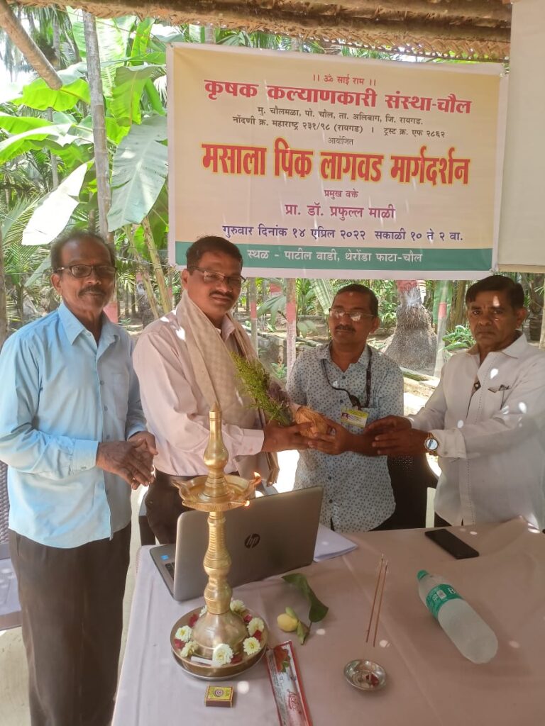 अलिबाग तालुक्यातील चौल पंचक्रोशितील शेतकर्यांसाठी हळद लागवड मार्गदर्शन कार्यक्रमाचे आयोजन कृषक कल्याणकारी संस्था, चौलच्या माध्यमातून करण्यात आले होते. यावेळी प्रमुख मार्गदर्शक म्हणून ते बोलत होते. संस्थेचे उपाध्यक्ष दिलीप नारायण पाटील यांच्या वाडीत नुकतेच या मार्गदर्शन शिबिराचे आयोजन करण्यात आले होते.